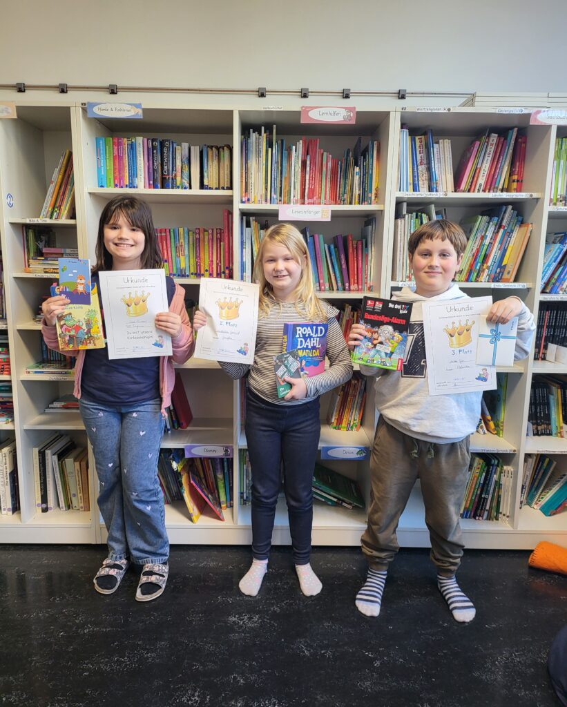 • Vorlesewettbewerb: In allen Klassen 1-3 fand der Vorentscheid zum Vorlesewettbewerb der Drittklässler statt. Am Mittwoch, dem 19.11.2025, wurde der Wettbewerb in der Schulbibliothek ausgetragen. Die Auswahl der vorgelesenen Texte war beeindruckend und reichte von klassischen Geschichten bis hin zu modernen Erzählungen. Eine Jury aus Schülerinnen der Schulbibliotheks-AG bewertete die Vorträge. Die Gewinner erhielten Buchgutscheine, Süßigkeiten und Urkunden als Anerkennung ihrer Leistungen. Wir sind sehr stolz auf alle Teilnehmer und Teilnehmerinnen